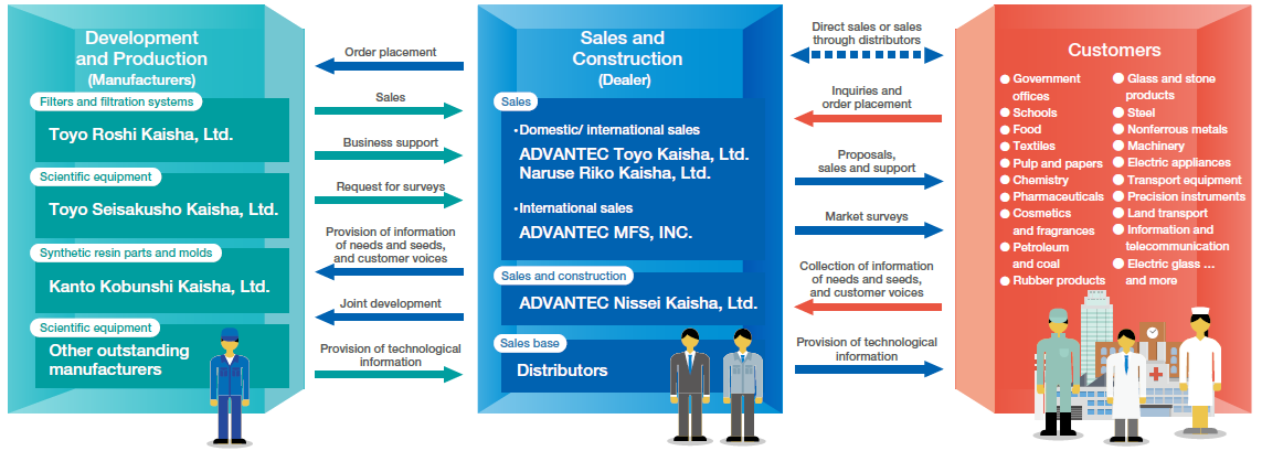 ADVANTEC 集團旗下包含七家公司,憑藉超過百年的經驗,ADVANTEC 建立了一個涵蓋製造、銷售、設施建設及售後服務的一體化系統,涵蓋濾紙、濾單元、試紙的製造,科學設備的研發與生產,以及來自優質製造商的集團產品與科學設備的全球銷售,能快速響應市場需求,提供量身定制的產品與服務,完整的一體化系統,從產品製造、銷售到設備建置,均能滿足客戶需求,並因此贏得了業界的高度信賴。