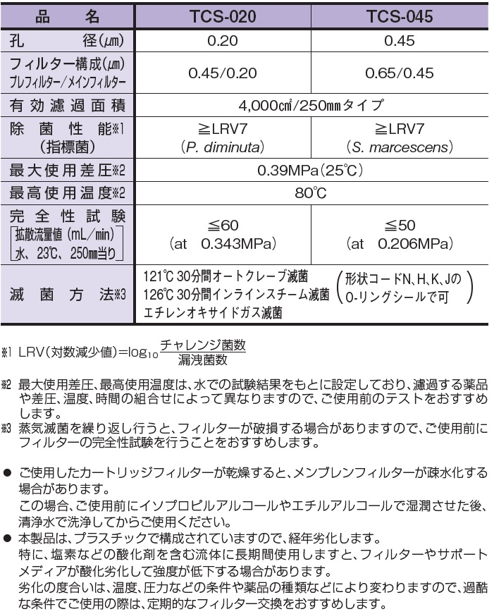 Avantec PES 通用型濾心 (TCS Type) 由聚醚碸 (PES) 濾膜及聚丙烯 (PP) 組成,具出色清潔度,高孔隙率、採用不同孔徑的雙層結構,阻力小、效率高、過濾壽命長,適用於化妝品業的顆粒去除及過濾除菌、食品業生產用水和產品的過濾除菌等等相關應用,濾心均經完整性測試,品質可靠、值得信賴 ► 產品訂購代碼: ► 產品規格: